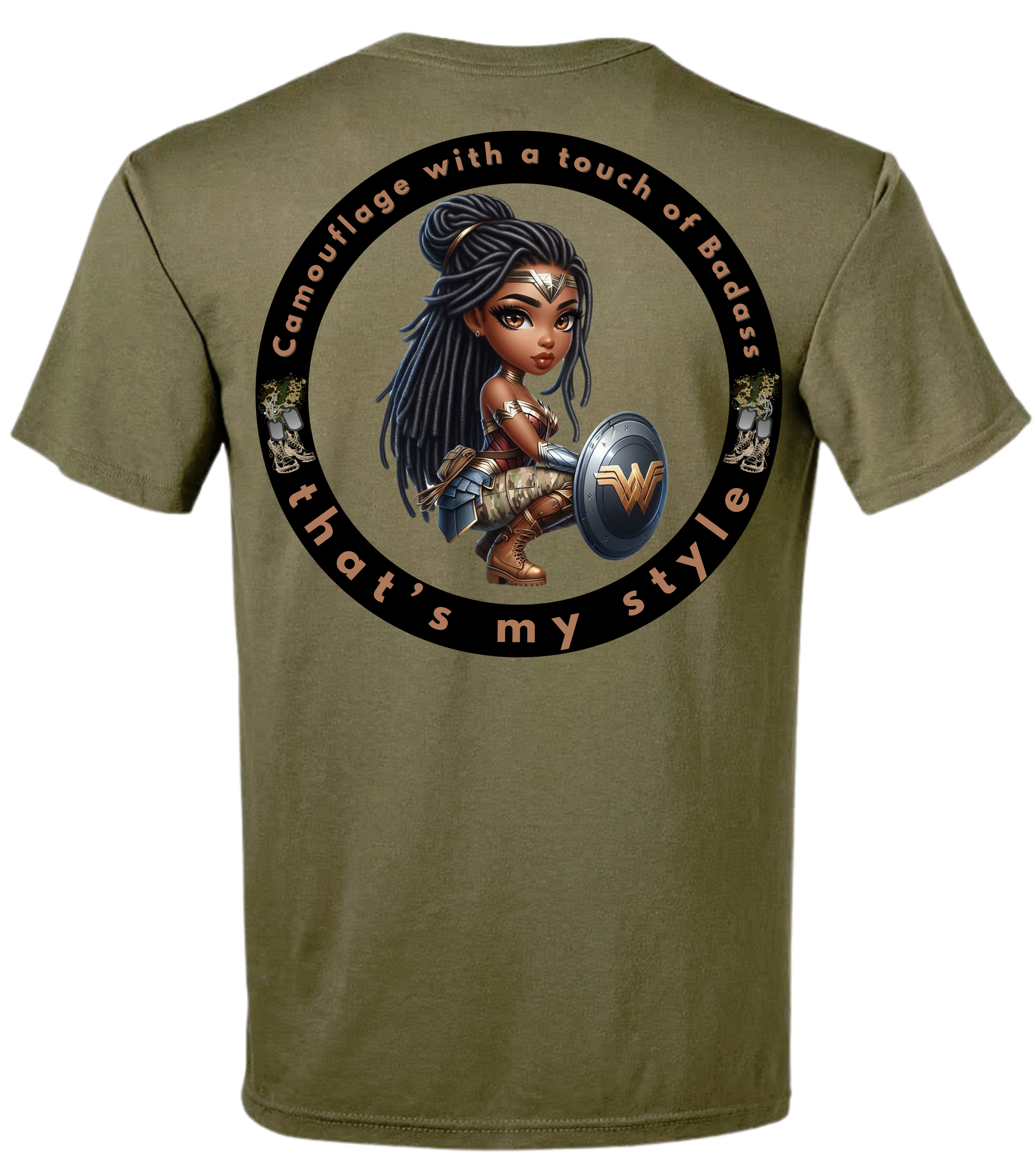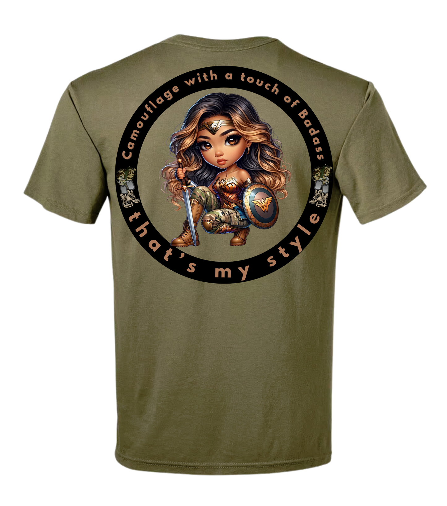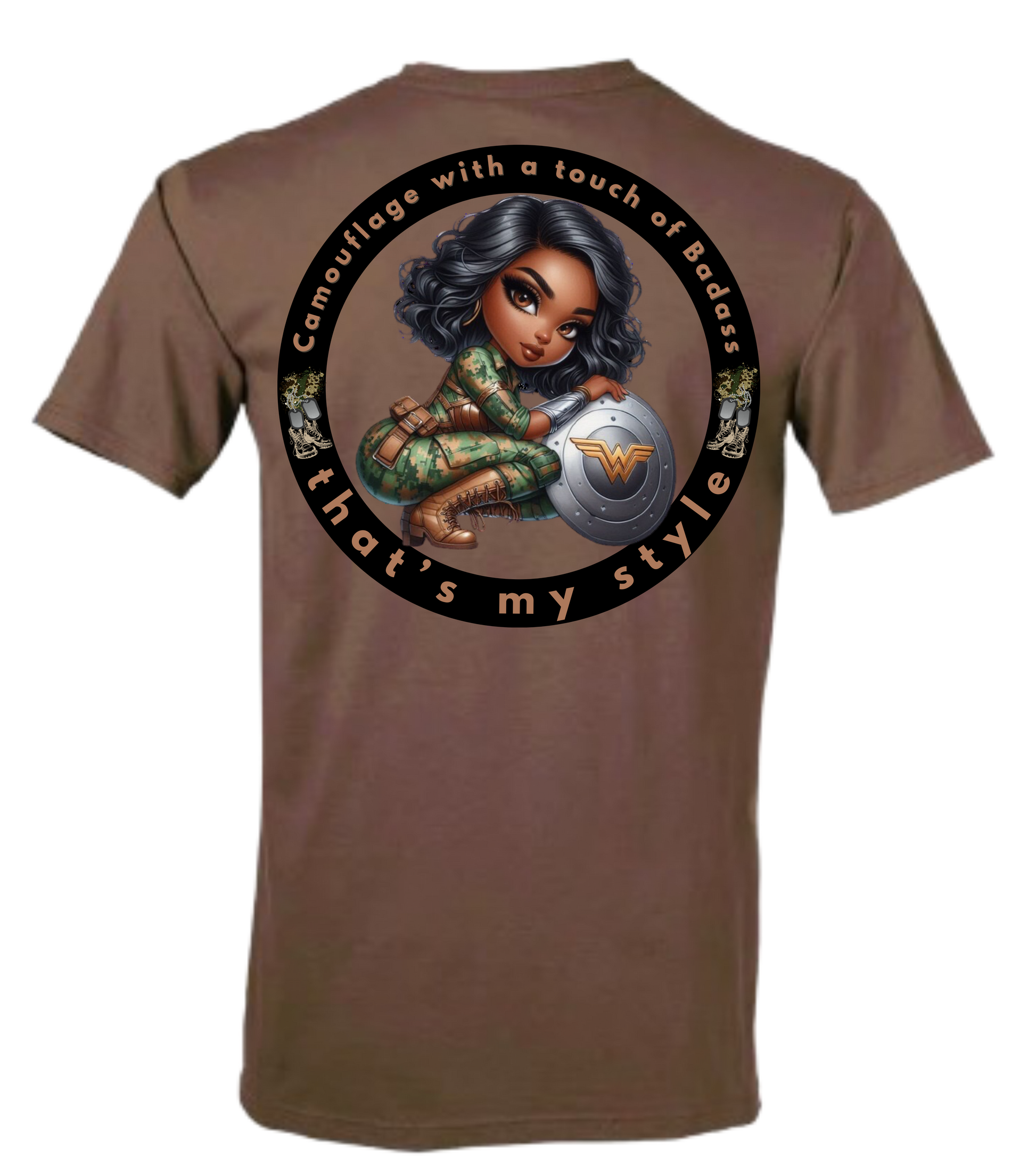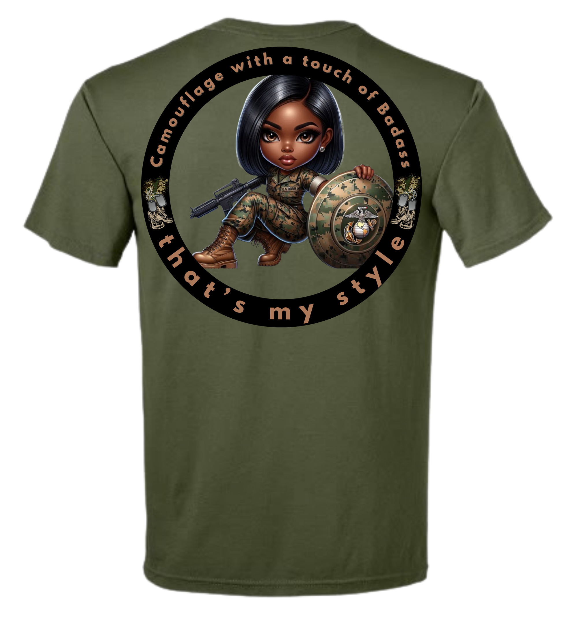 Camouflage with a touch of badass that's my style Uniform shirt for Air Force, Army, Navy, and Marine Uniform Wear. Available in Coyote Brown, Tan, and Olive Green.