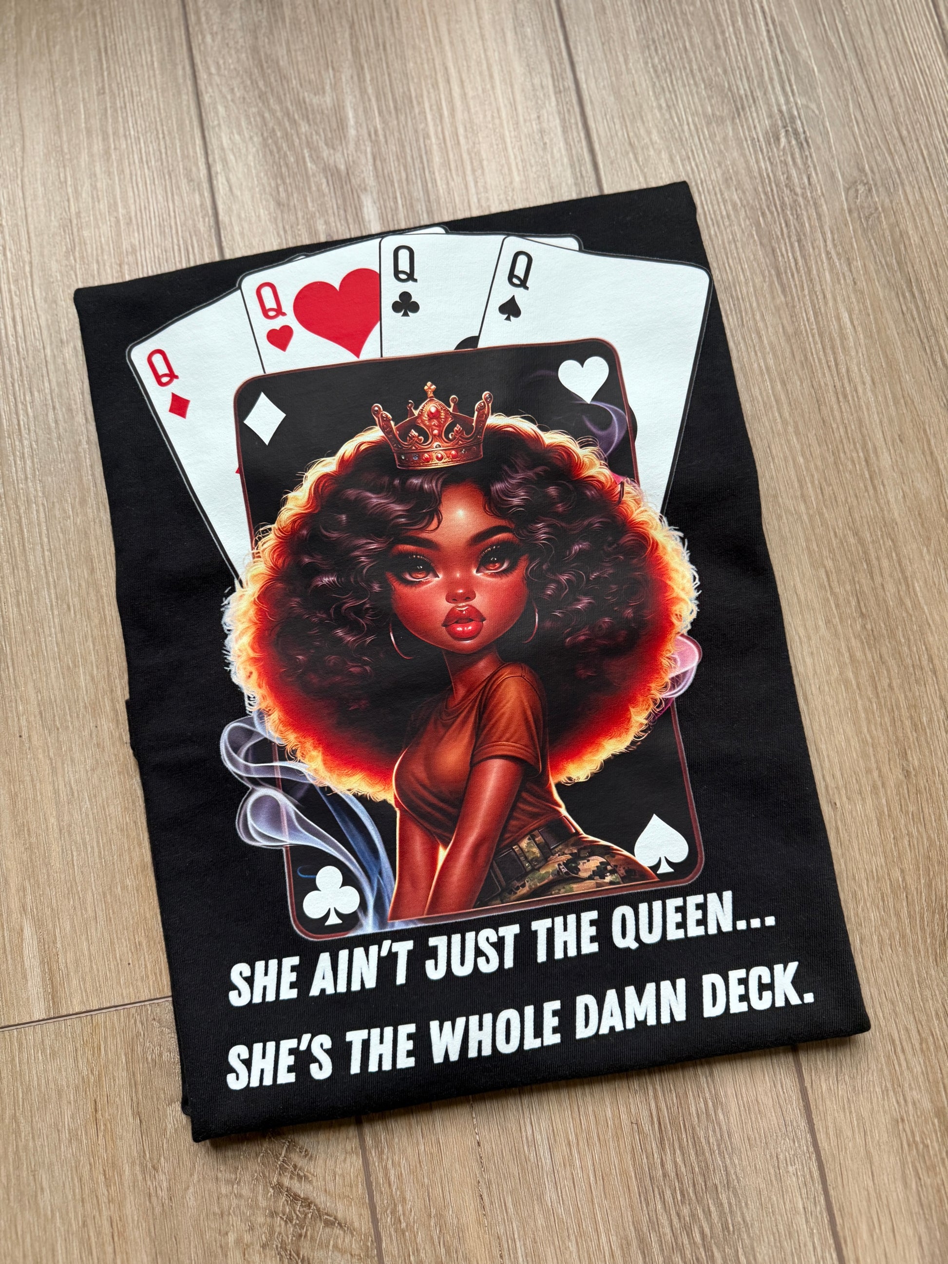Step aside, because royalty has entered the room. This statement tee features a stunning crowned Queen surrounded by all four suits of the deck – hearts, clubs, spades, and diamonds – reminding the world: