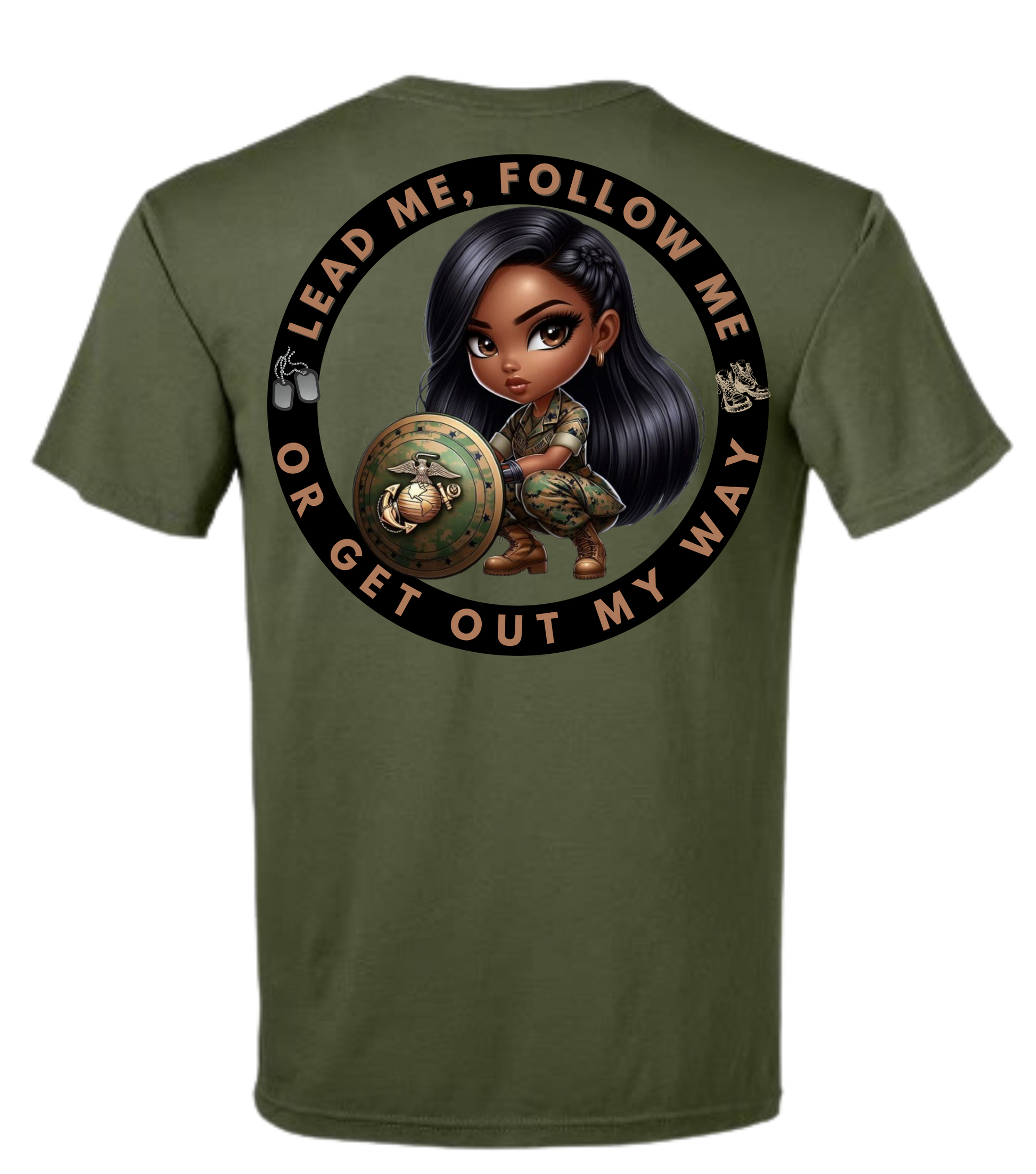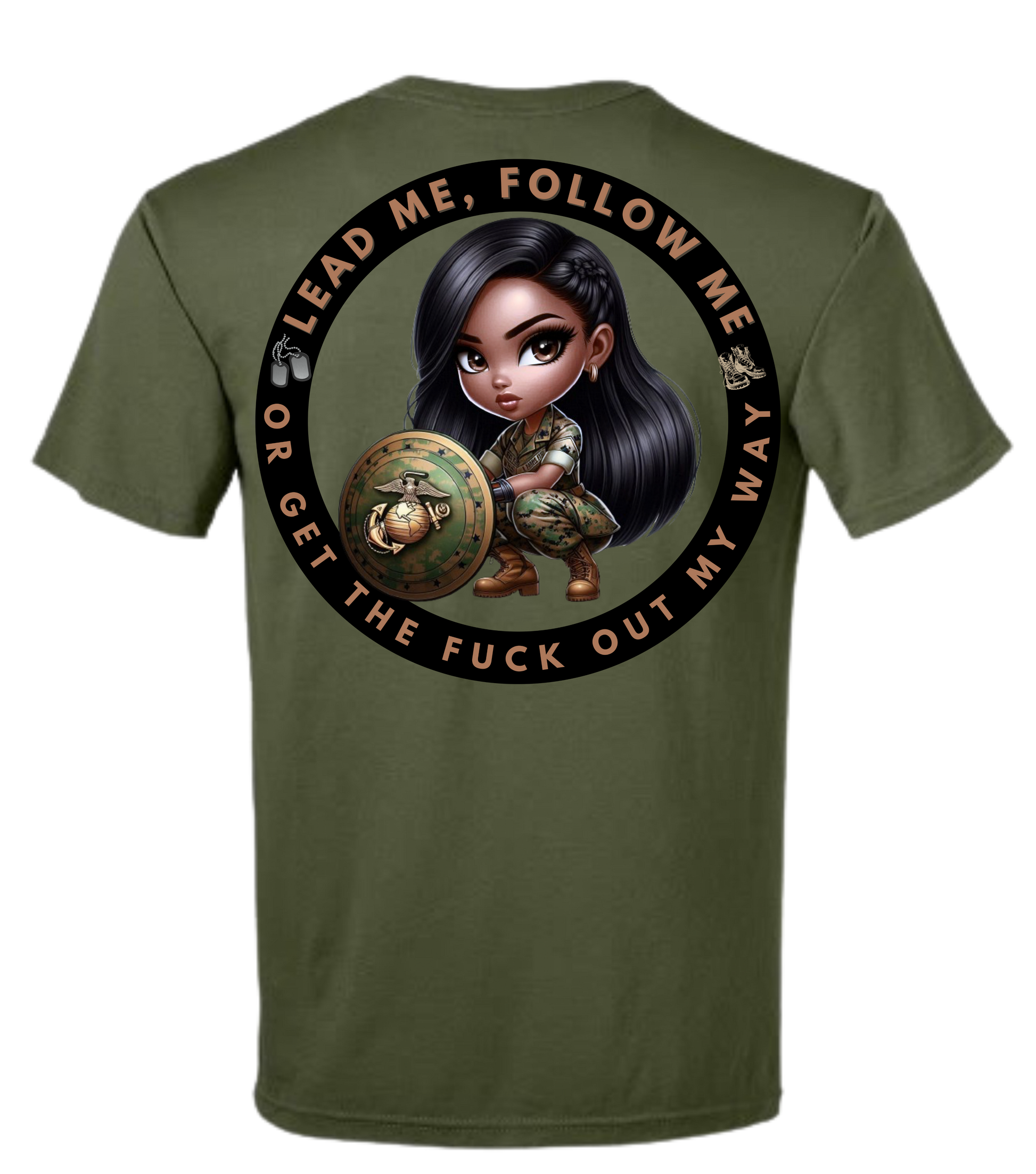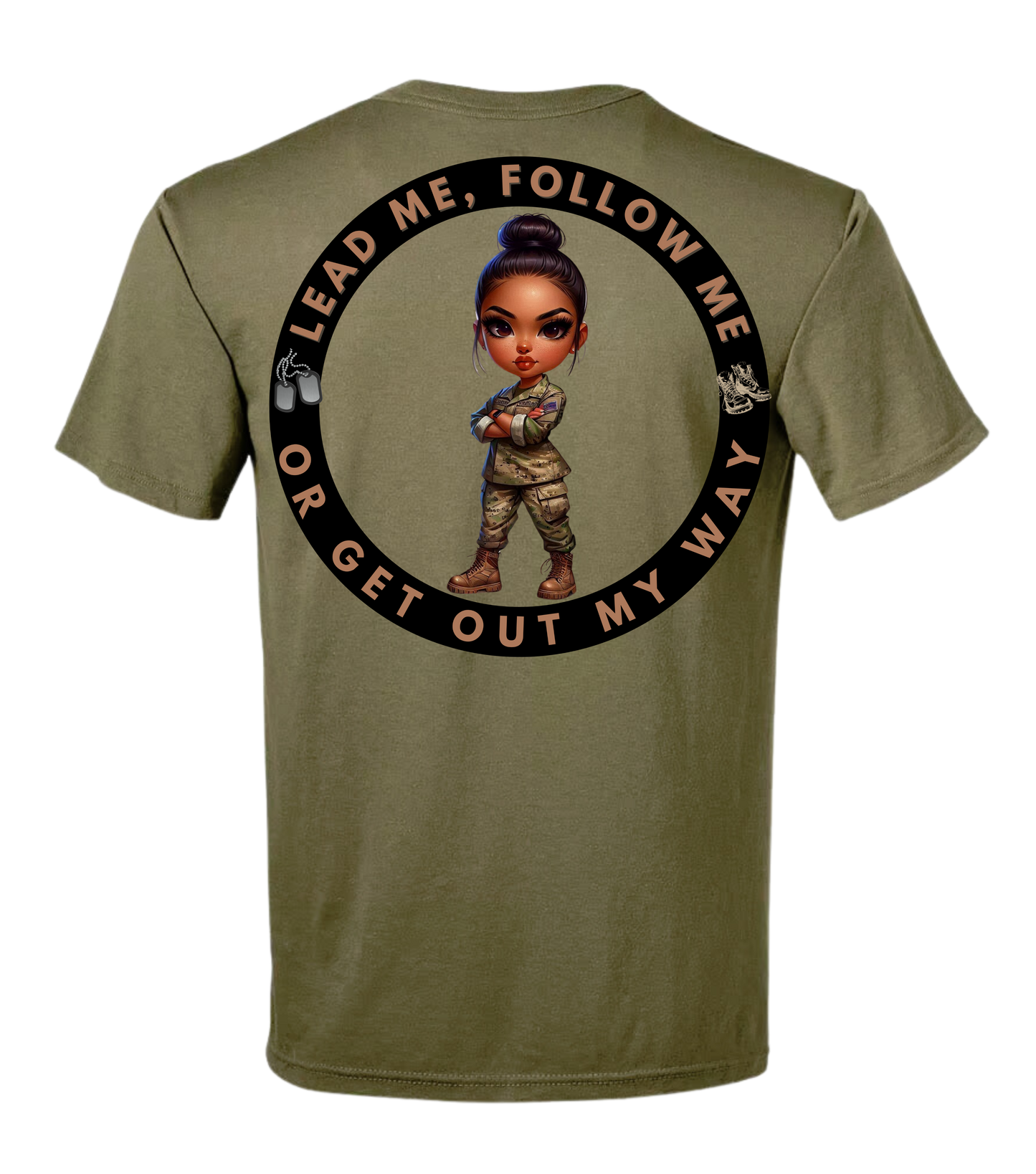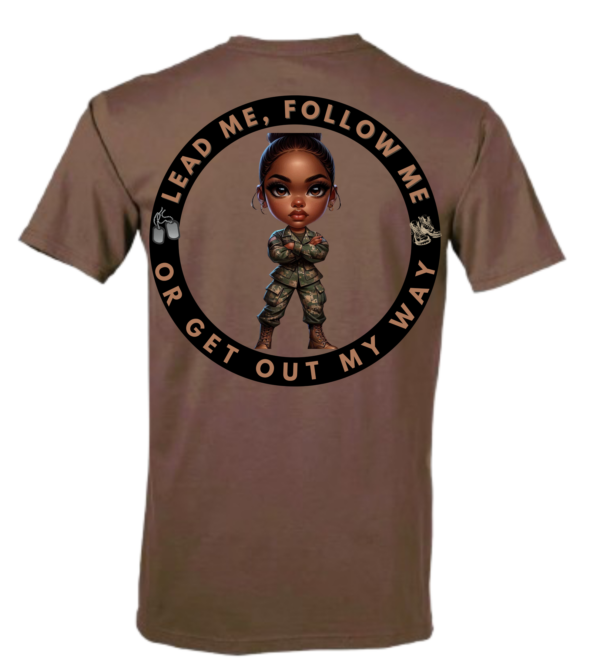 Lead Me, Follow Me or Get Out My Way Uniform Shirt for Air Force, Army, Navy and Marine Uniform Wear. Available in Coyote Brown, Tan, and Olive Green.