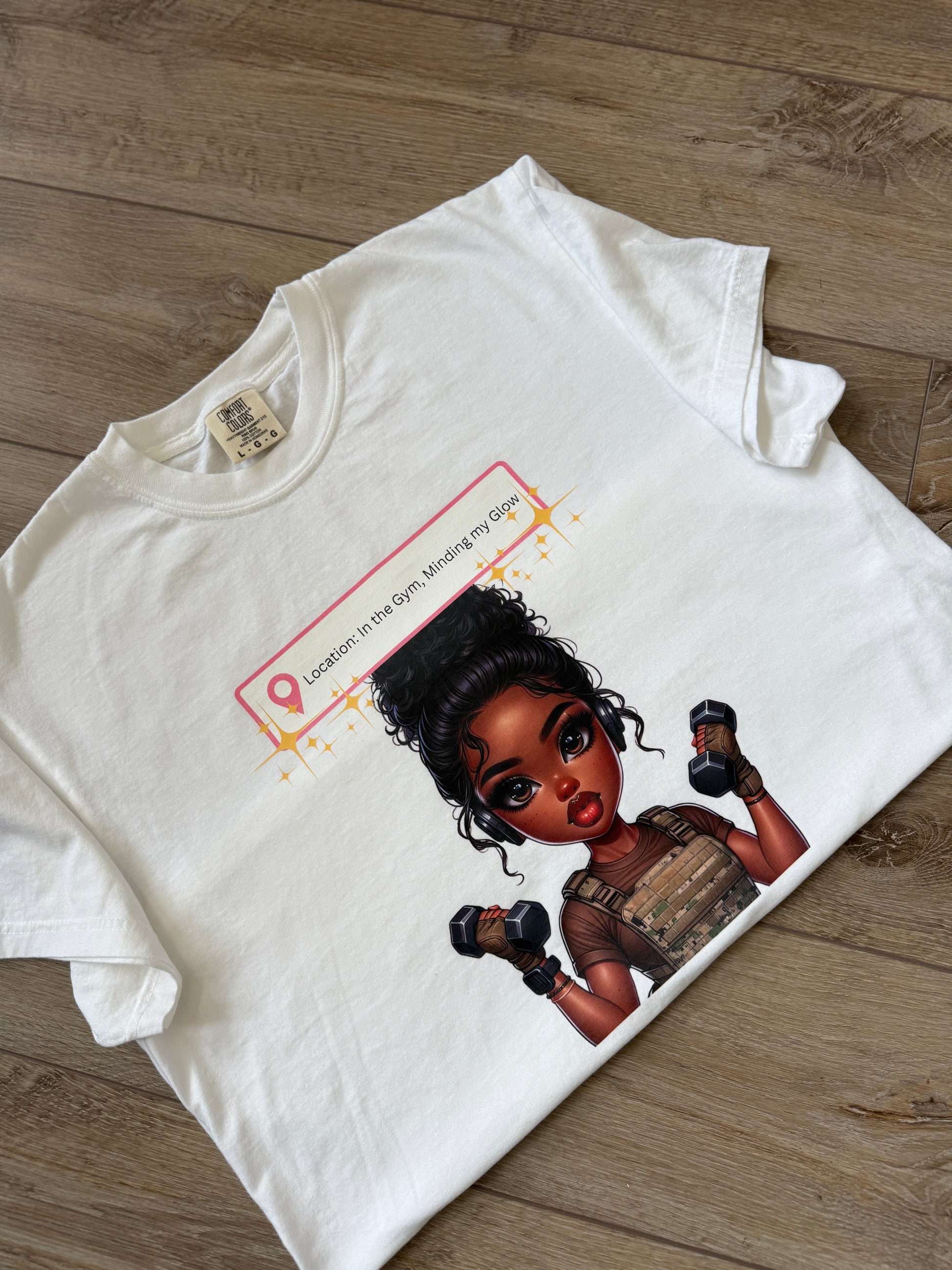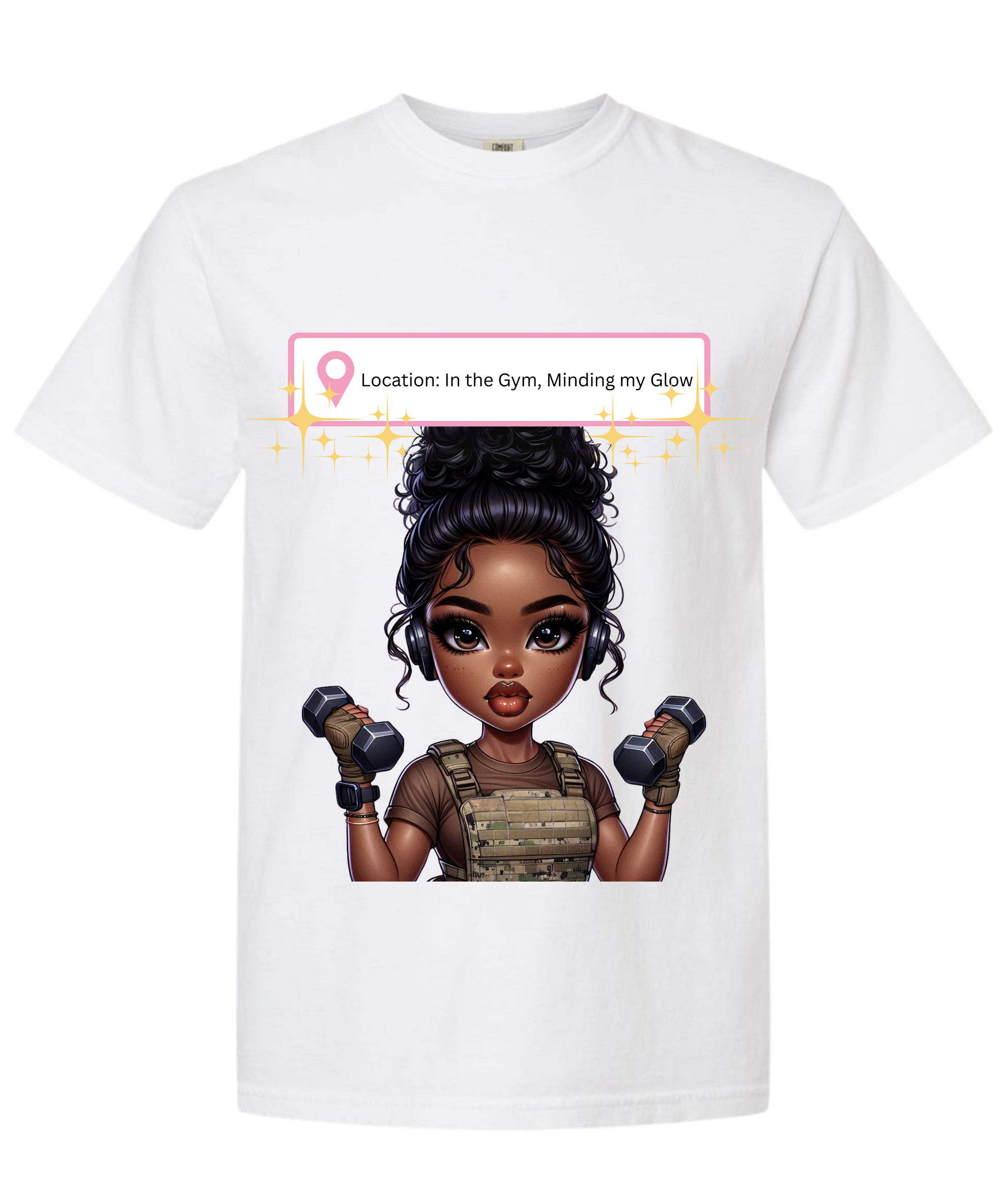 “Minding My Glow” Military Gym Girl Tee – Strength Meets Style