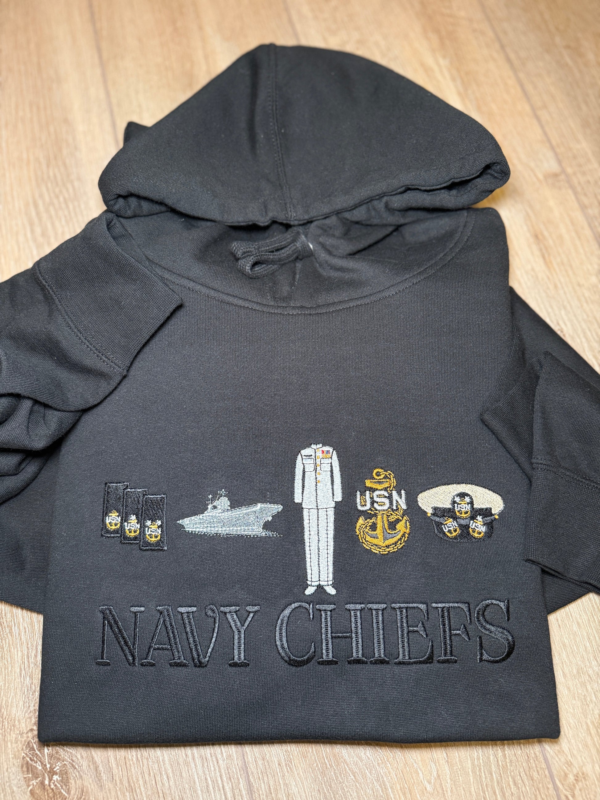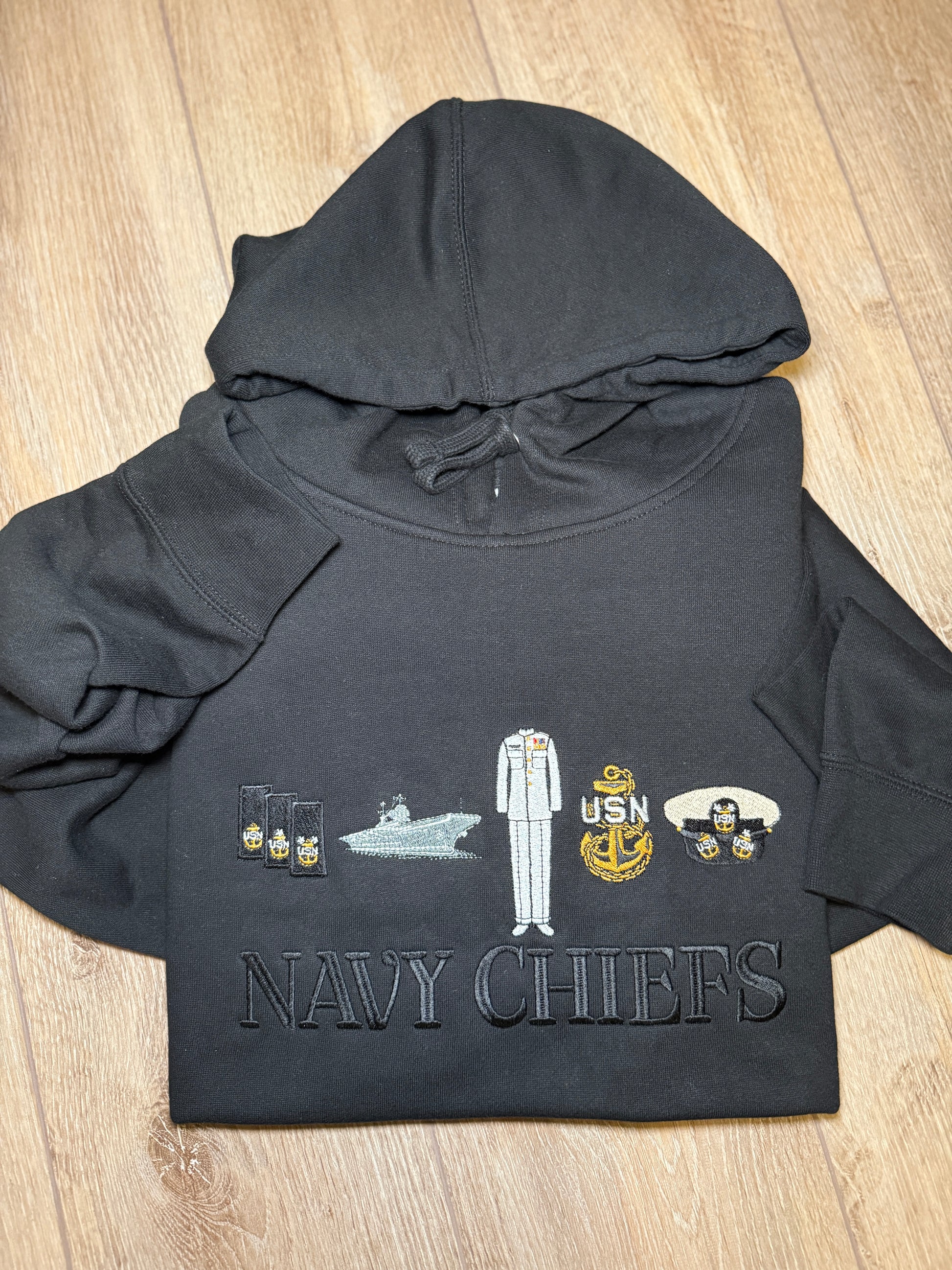 Honor tradition. Wear your pride. This custom Navy Chiefs sweatshirt is embroidered with precision and detail to represent the strength, leadership, and legacy of the Chief’s Mess. Featuring high-quality thread embroidery of Navy anchors, ranks, ship silhouette, and “NAVY CHIEFS” stitched boldly across the front—this sweatshirt isn’t just apparel, it’s a statement.