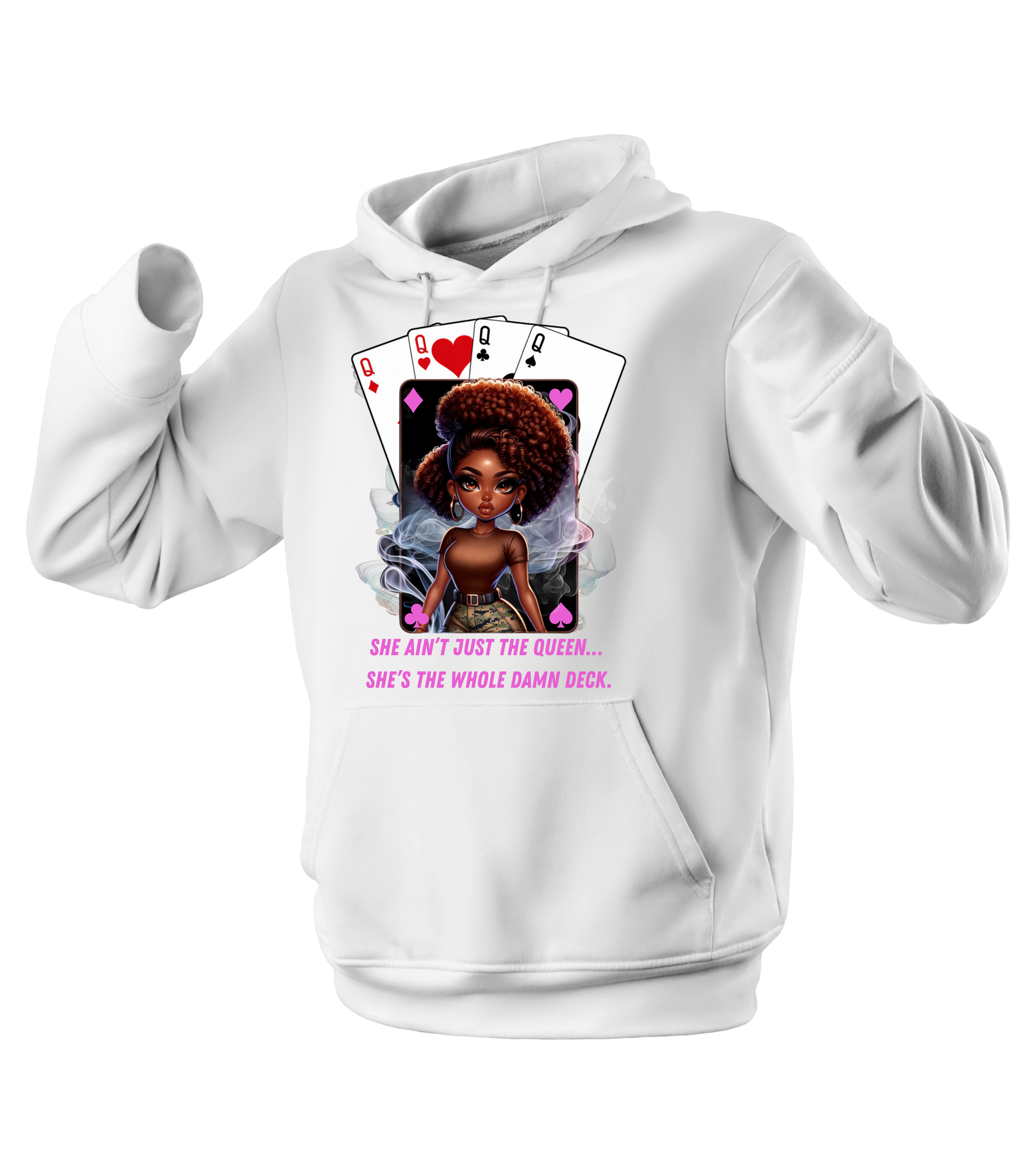 This hoodie isn’t just a vibe—it’s a whole proclamation. Featuring a beautifully illustrated Queen framed by the four suits of the deck, this custom design reads loud and clear: