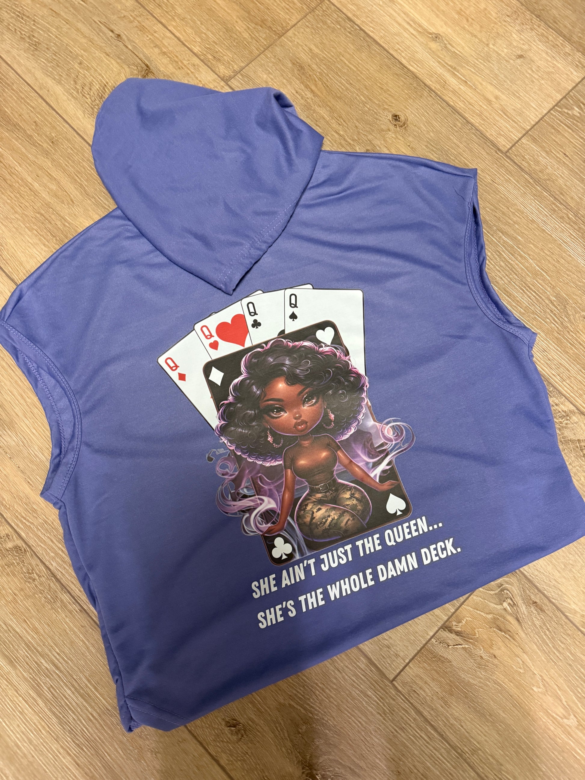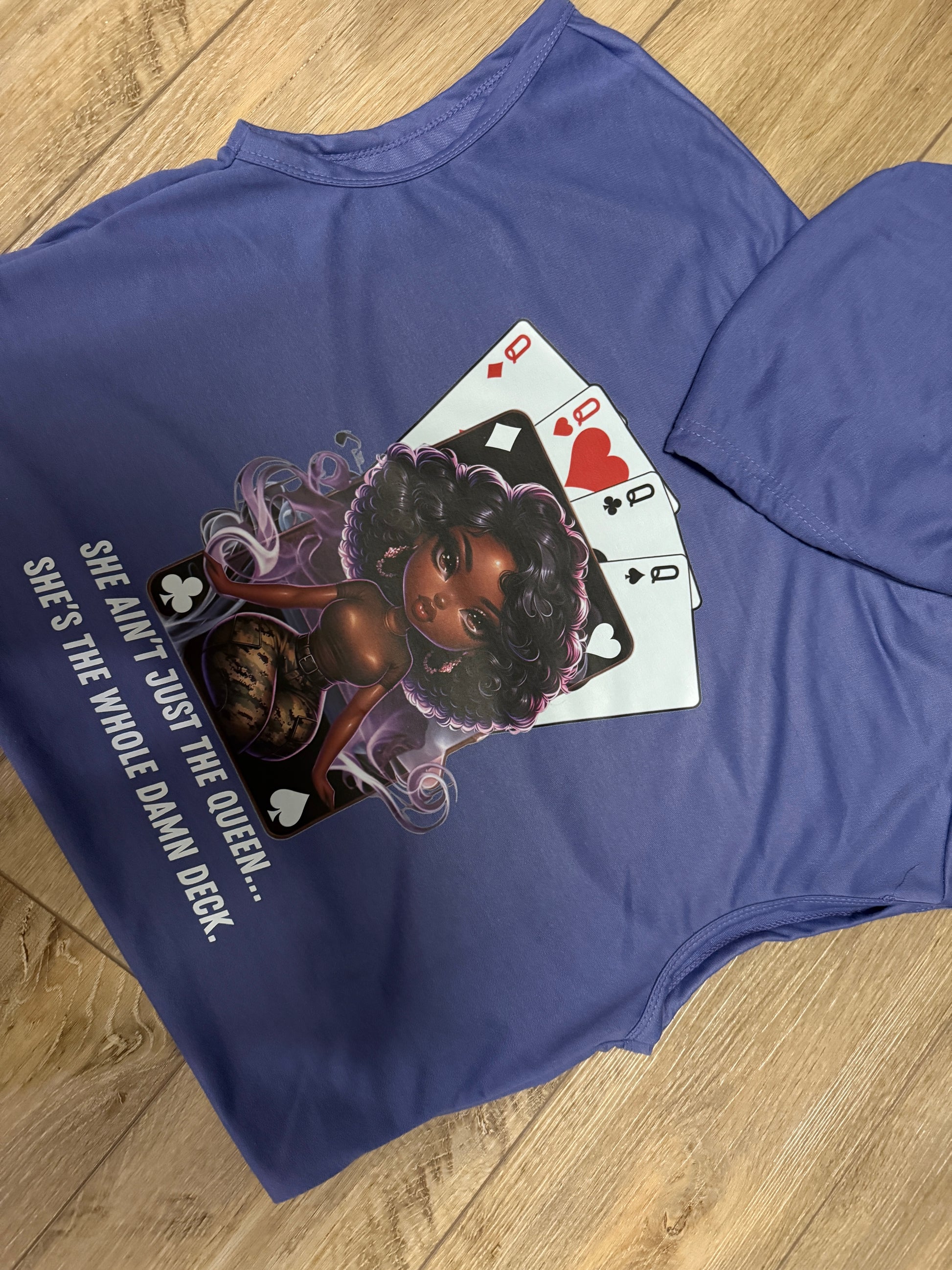 Step aside, because royalty has entered the room. This statement tee features a stunning crowned Queen surrounded by all four suits of the deck – hearts, clubs, spades, and diamonds – reminding the world: