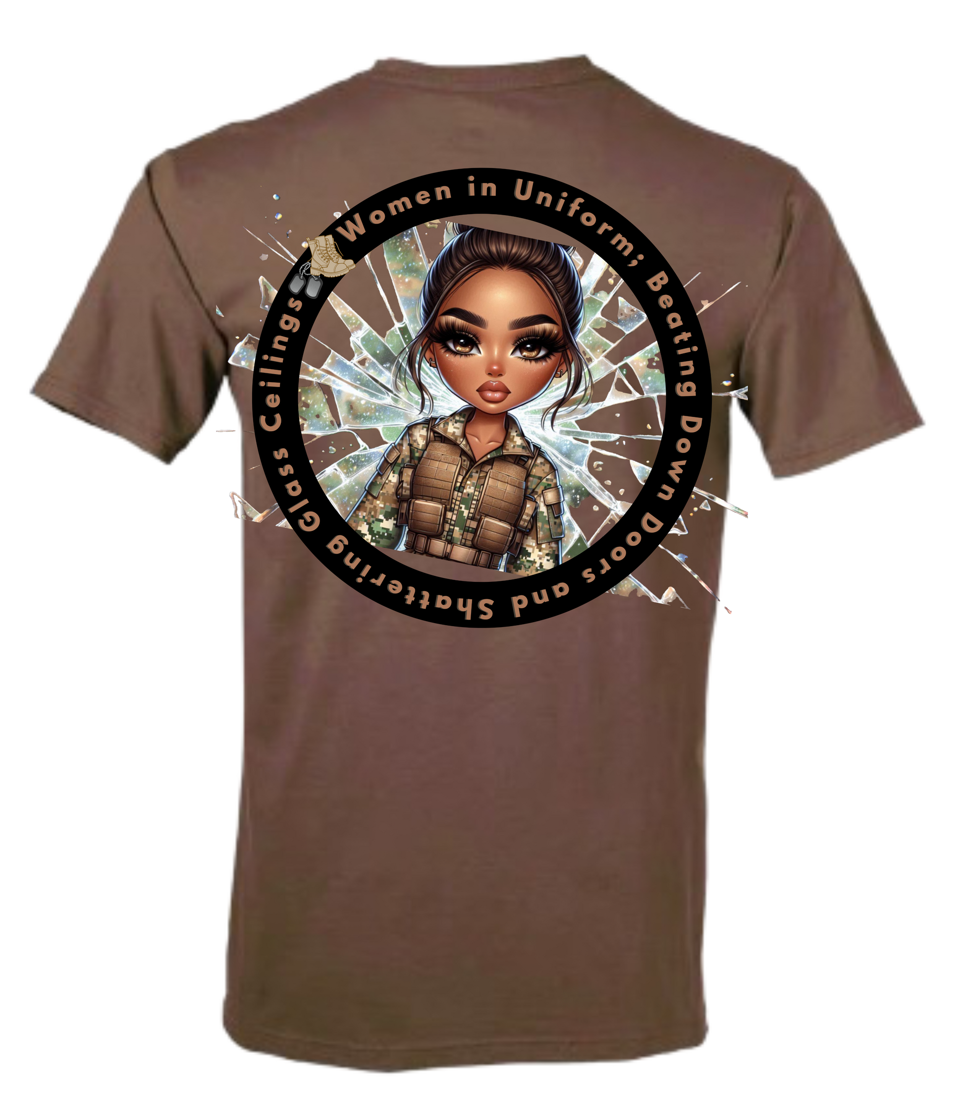 Women In Uniform; Beating Down Doors and Shattering Glass Ceilings Uniform T-shirt. Available for Air Force, Army, Navy and Marine Uniform wear. Available in Coyote Brown, Olive Green, and Tan.